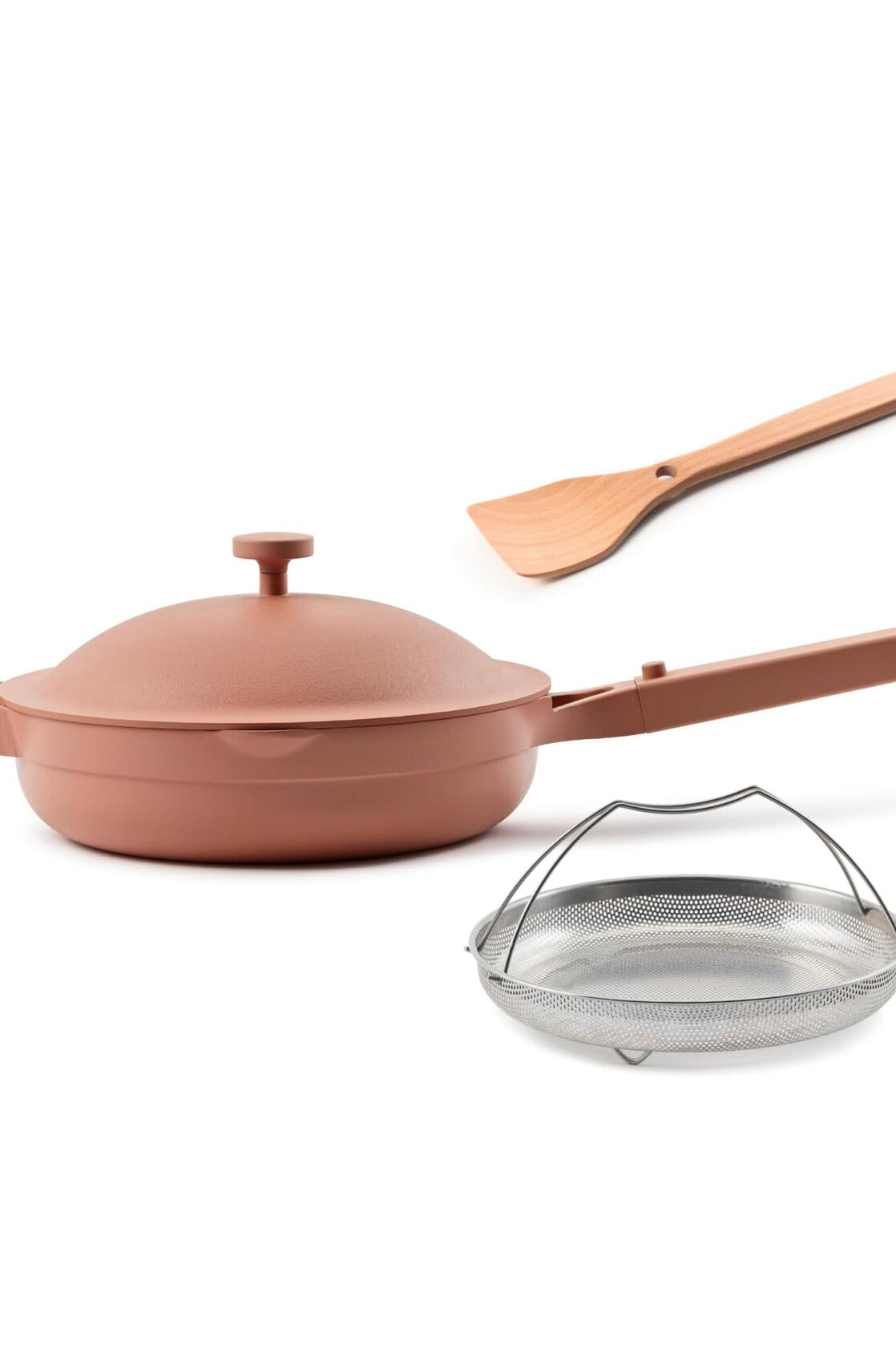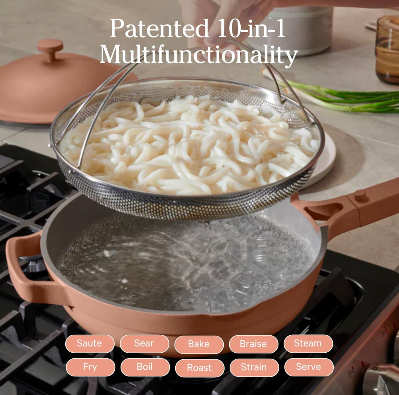 A 10.5-inch pan that braises, sears, steams, strains, sautes, fries, boils, bakes, serves, stores…does it all!